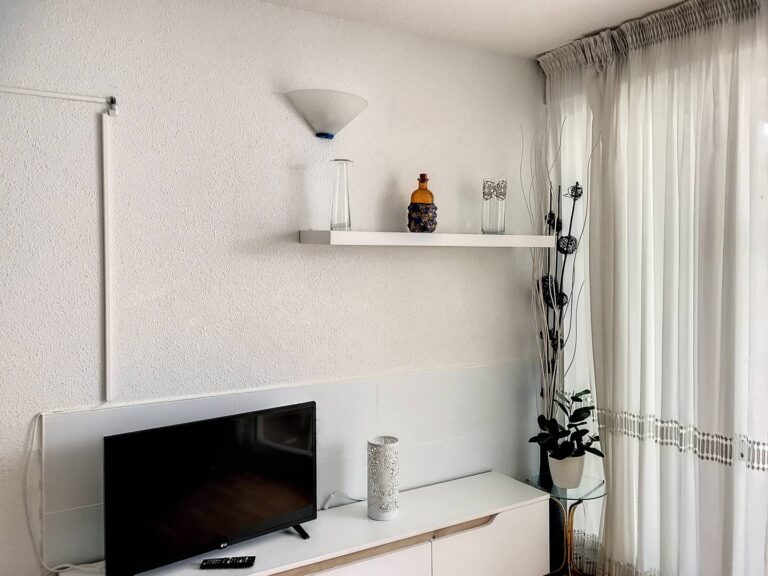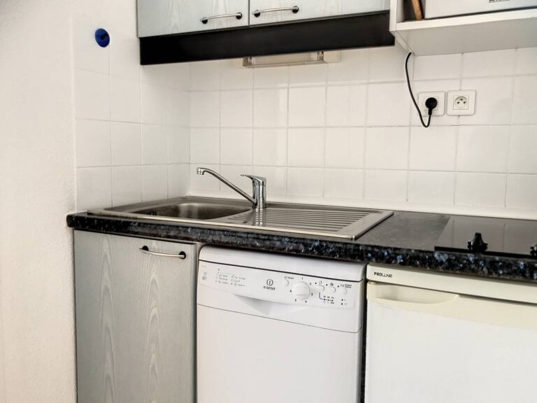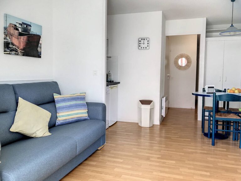 Comprend : séjour avec canapé convertible et télévision, coin cuisine avec réfrigérateur, lave-vaisselle, micro-ondes, plaque vitrocéramique, cafetière filtre, salle de bains avec baignoire et lavabo, WC séparés, 1 chambre avec 1 lit en 140×190 et placard. Grande terrasse couverte avec salon de jardin. Parking commun. Capacité : 2/4 personnes.