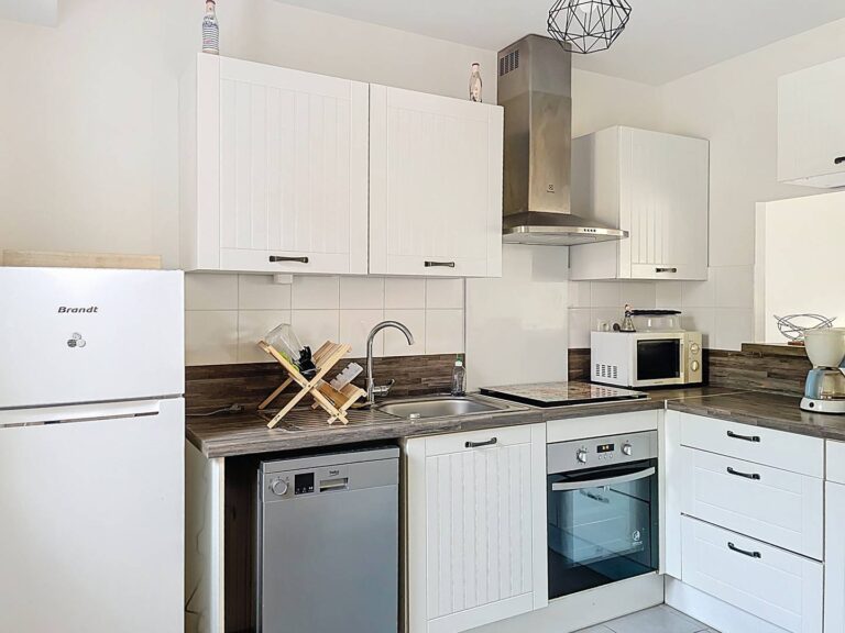 Ce logement, exposé sud-est, peut accueillir jusqu’à 4 personnes. Le rez-de-chaussée comprend un séjour avec salon et télévision, ainsi qu’une cuisine ouverte entièrement équipée. Un WC indépendant avec lave-mains et lave-linge complète ce niveau.