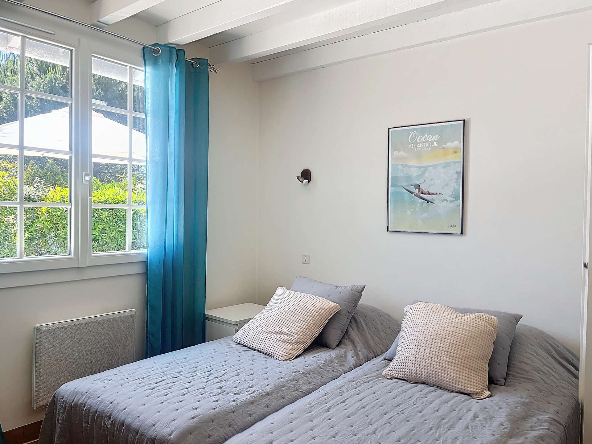 Elle est composée de : séjour avec espace repas et salon ;   cuisine équipée (four, lave-vaisselle, cafetière filtre) ;   1 chambre avec 1 lit en 140, 1 chambre avec 2 lits en 90, 1 chambre avec 2 lits superposés (en 140 en bas et en 90 en haut) et 1 lit en 90 ;   1 salle d’eau avec douche et lavabo ;   2 WC séparés ;   1 cellier avec douche, lave-linge et sèche-linge. Joli terrain paysagé de 700 m². WIFI.