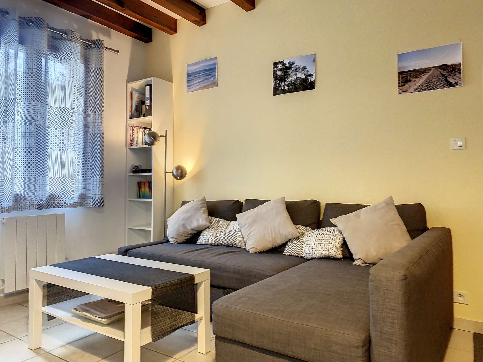 Elle est composée de : séjour avec canapé convertible et télévision ;   kitchenette avec réfrigérateur-congélateur, four et plaques électriques, lave-vaisselle, micro-ondes;   lave-linge. A  l’étage : 1 chambre avec lit 140*190, porte-fenêtre donnant sur le balcon, 1 chambre avec 2 lits simples, fenêtre, 1 salle d’eau avec douche, lavabo, 1 WC séparé. Lit parapluie et chaise haute. Terrasse exposée sud.