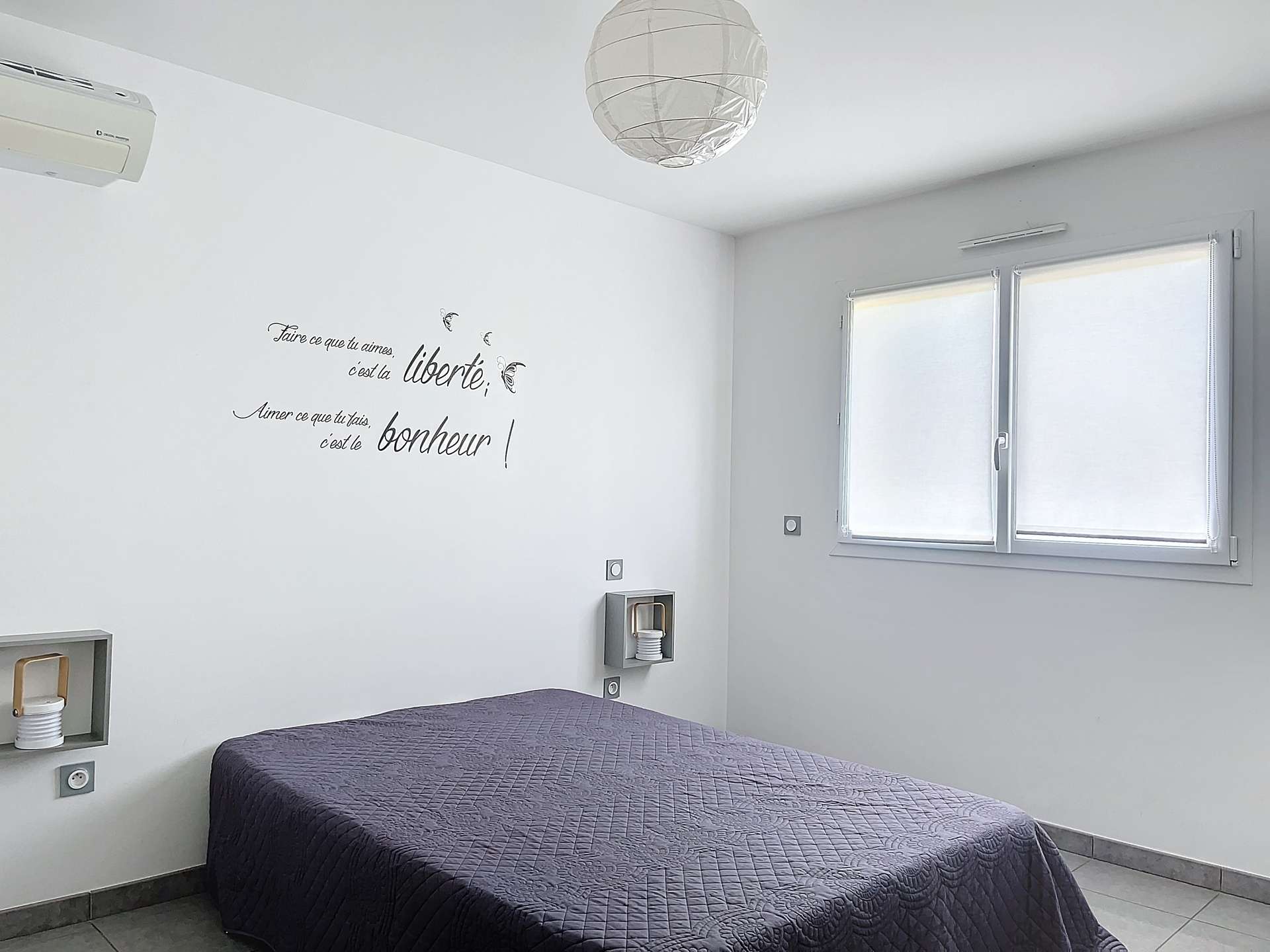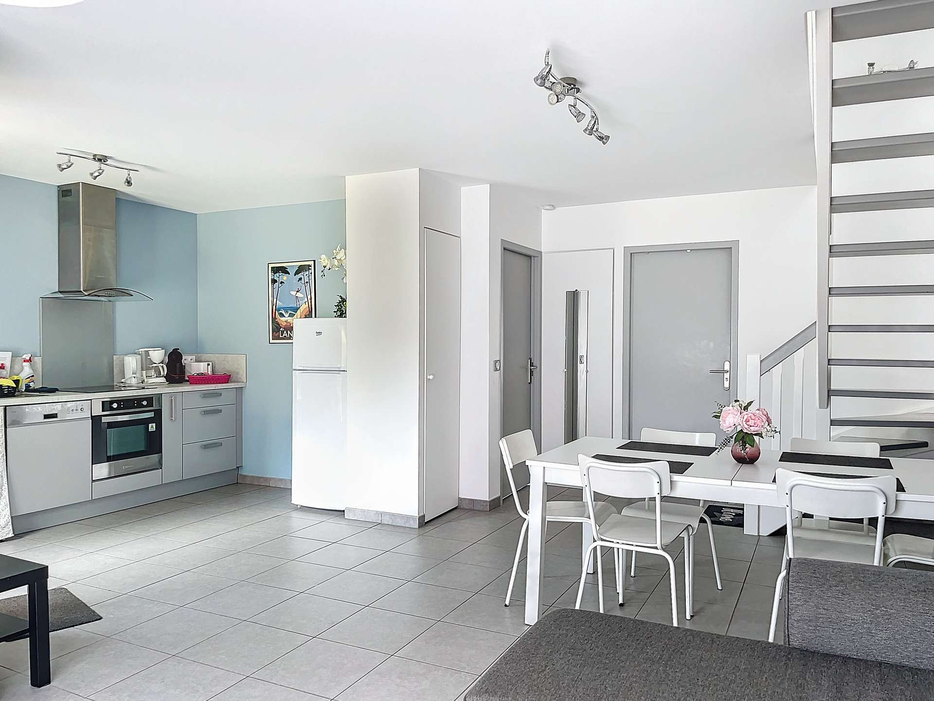 Composition RDC : SEJOUR avec canapé convertible, TV, baie vitrée donnant sur la terrasse. CUISINE ouverte et équipée : plaques vitrocéramiques, four, hotte, frigo-congélateur, micro-ondes. CHAMBRE 1 avec lit en 140 et placard. SALLE D’EAU avec douche et WC.