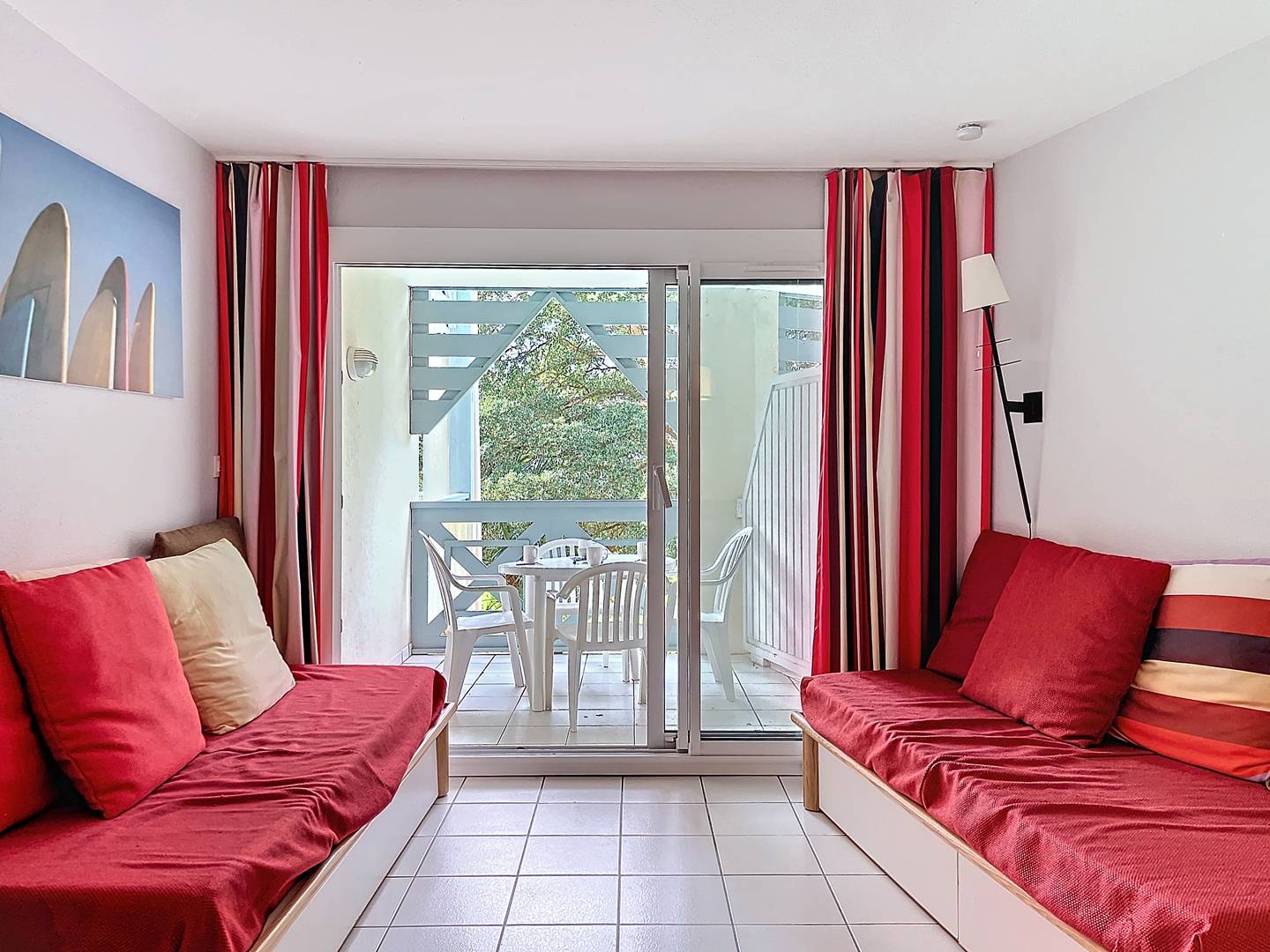 MOLIETS PLAGE : T2 au premier étage, avec vue sur le golf, dans résidence de tourisme avec piscines. A proximité: Plage à 1.5 km, golf, tennis, pistes cyclables, courant d’Huchet. Pour le surf, la baignade, les balades à vélo, idéal pour de belles vacances et respirer l’air des Landes.