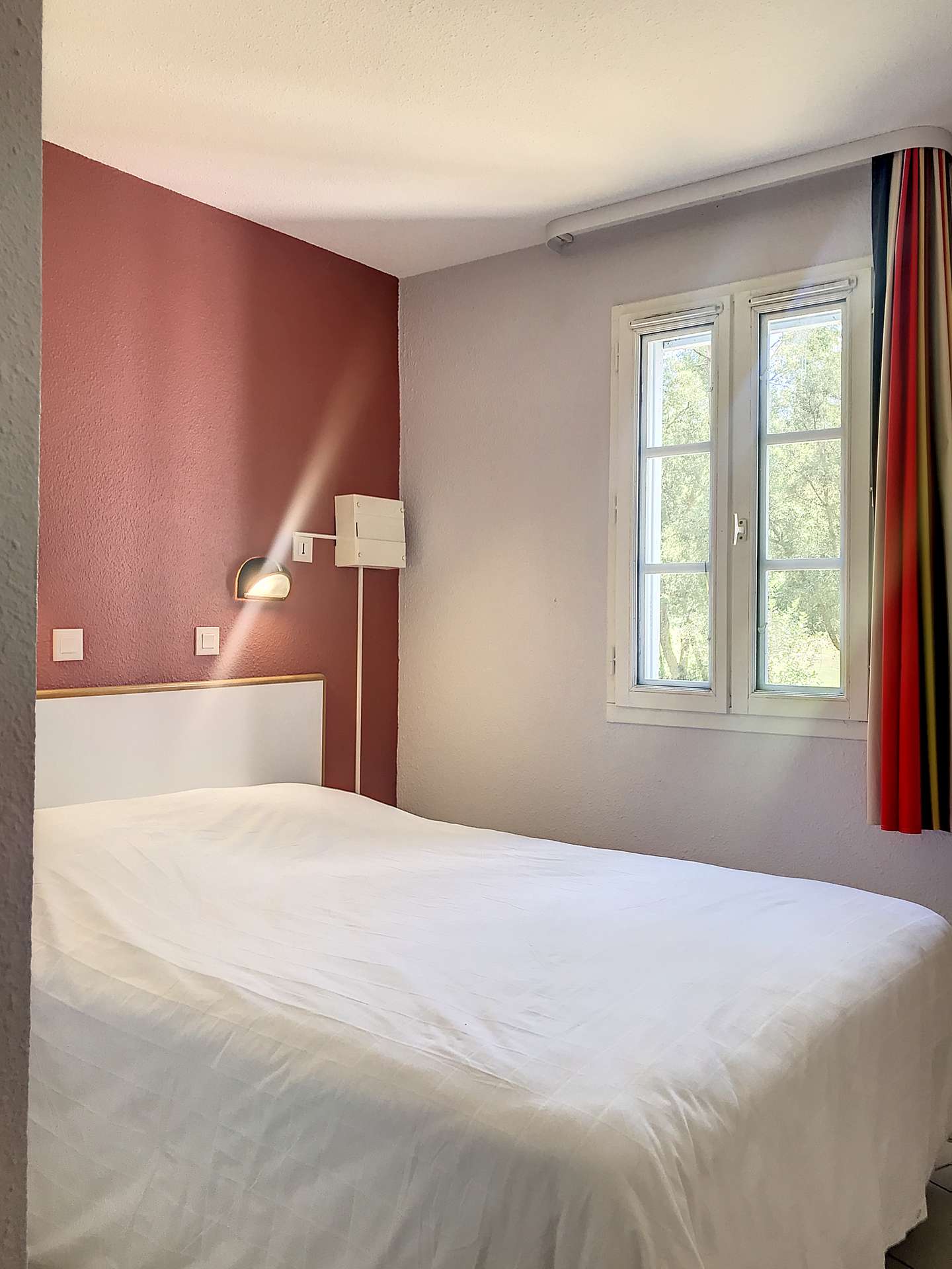Il comprend : entrée, placard de rangement, chambre lit 140 x 190, cabine avec 2 lits superposés en 90*190, salle de bains avec baignoire, WC séparés, séjour avec 2 couchages, télévision, kitchenette (lave-vaisselle, cafetière filtre, plaque vitrocéramique 2 feux, réfrigérateur, micro-ondes…). Terrasse avec salon de jardin donnant sur le golf. Laverie dans la résidence.