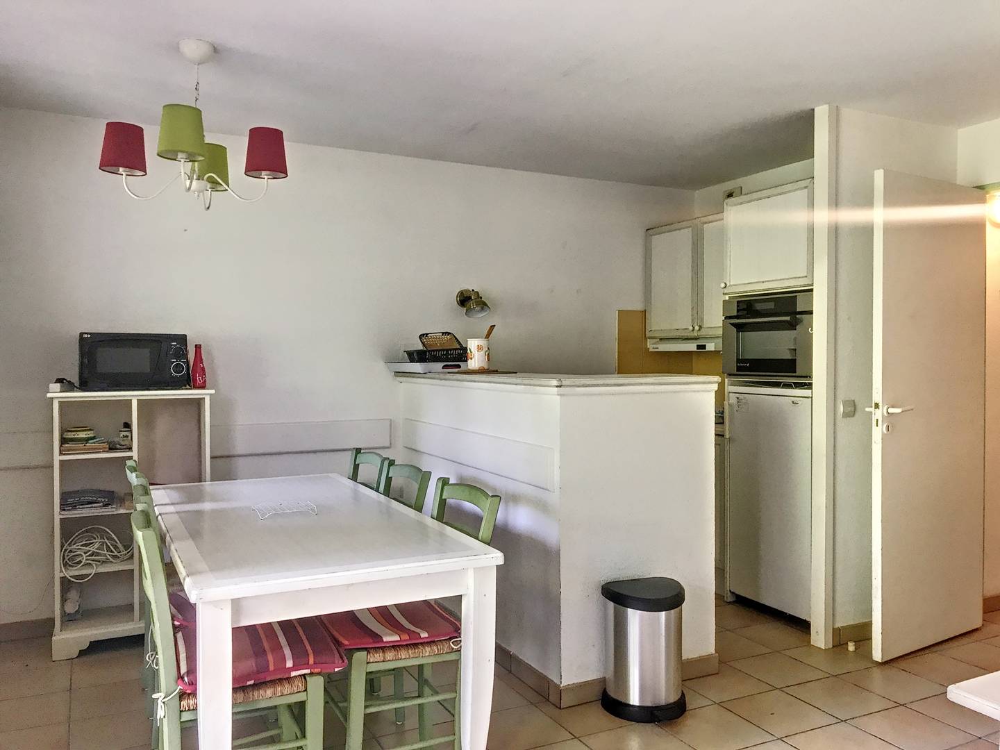 Il comprend : entrée, séjour avec canapé et télévision, kitchenette (plaque de cuisson, frigo, lave-vaisselle, Nespresso, micro-ondes…), 1 chambre avec 1 lit en 140 x 190, 1 cabine avec 2 lits superposés en 90*190, salle de bains avec baignoire et lavabo, salle d’eau avec douche, lavabo et WC. Terrasse avec salon de jardin donnant sur le golf et la piscine. Laverie dans la résidence. Capacité : 4 personnes.