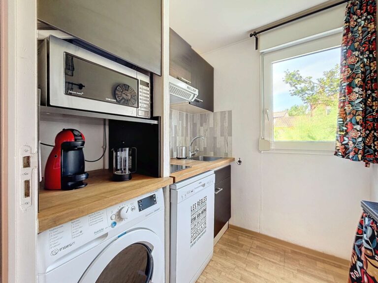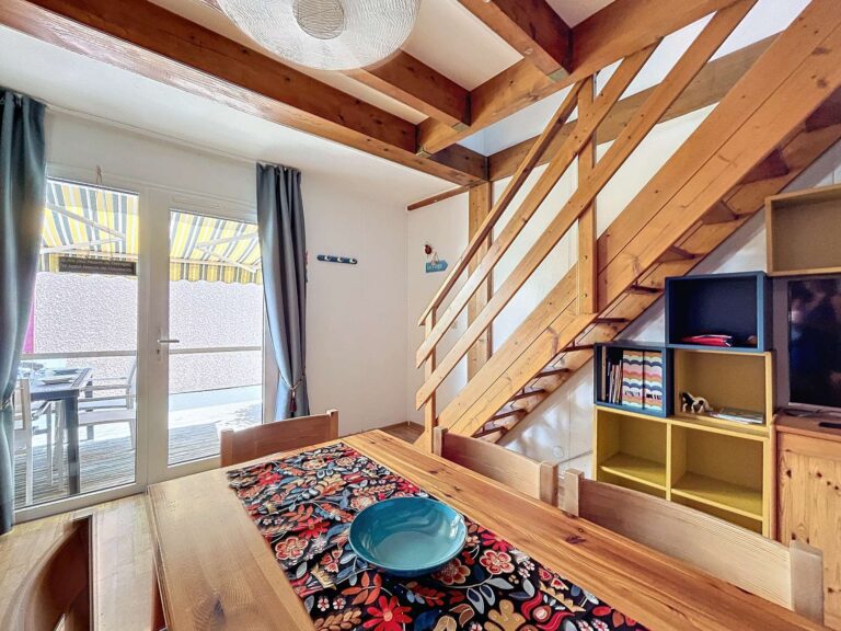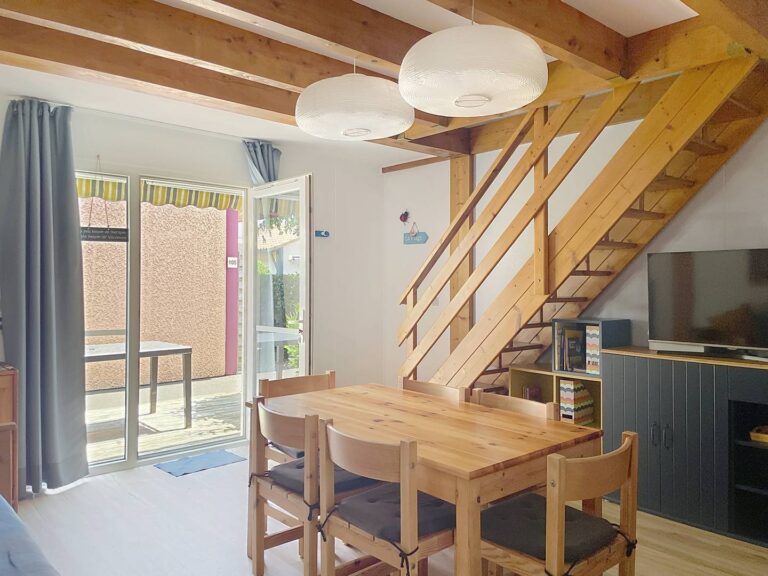 Composition : rez-de-chaussée : séjour : banquette lit gigogne (couchage en 140), TV, porte-fenêtre donnant accès à la terrasse, réfrigérateur-congélateur, kitchenette séparée (lave-vaisselle, lave-linge séchant, microondes), salle d’eau (douche, lavabo), WC séparé. TERRASSE en bois. Store manuel. Salon de jardin. 2 vélos adultes à disposition. ETAGE : CHAMBRE 1 : lit en 140, chevets + lampes, grand placard. CHAMBRE 2 : 2 lits en 90, chevet + lampe, placard. Capacité d’accueil : 4/6 Personnes.
