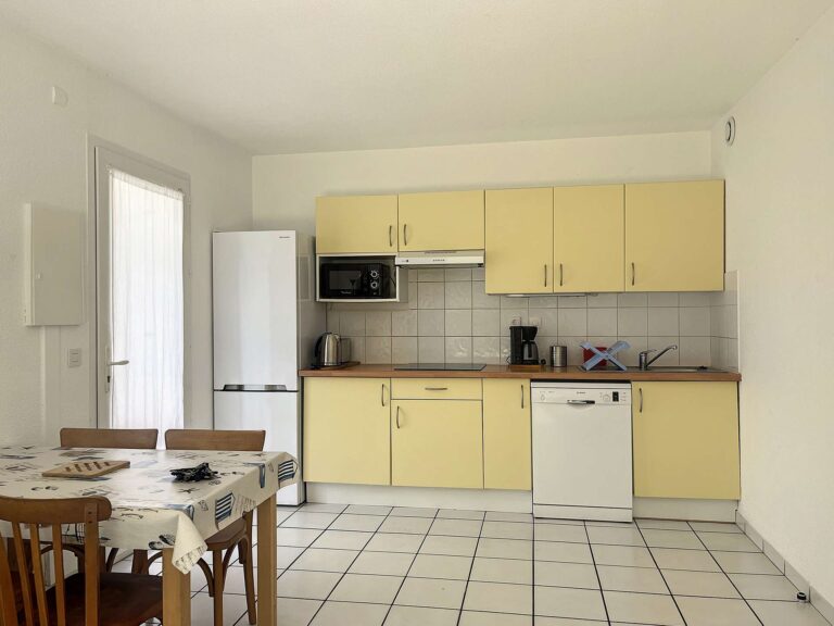 Composition : Séjour/cuisine : canapé convertible, télévision, baie vitrée donnant sur la terrasse, cuisine équipée (lave-vaisselle, réfrigérateur-congélateur, micro-ondes, cafetière filtre, grille-pain, plaques induction), salle de bains : baignoire, vasque, WC, placard avec lave-linge. Chambre : lit double, grand placard, porte-fenêtre donnant sur la terrasse. Terrasse carrelée avec salon de jardin. 1 place de parking privative. Capacité d’accueil : 2/4 personnes.