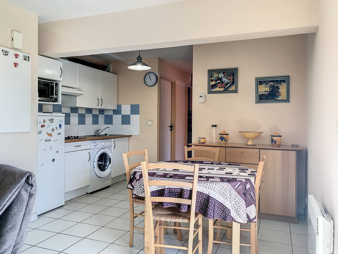 Composition : Séjour/Kitchenette avec canapé, 1 fauteuil, TV, chaine hifi, table basse, table + chaises, plaques vitrocéramiques, réfrigérateur, combiné four/micro-ondes, grille-pain, cafetière filtre, lave-linge, plancha électrique. Chambre 1 avec 1 lit en 150, placard. Chambre 2 avec 2 lits simples superposés + 1 lit gigogne, placard, baie vitrée donnant sur la terrasse. Salle d’eau avec douche et lavabo. WC séparé. Terrasse couverte avec table et chaises. Local vélos.