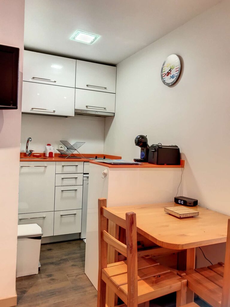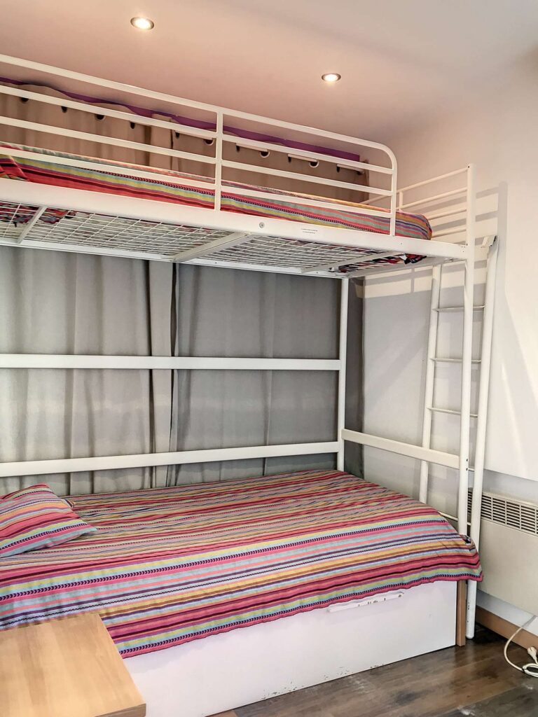 Composition : SEJOUR : canapé convertible, TV écran plat. Baie vitrée donnant accès au balcon. KITCHENETTE : réfrigérateur top, plaque 2 feux vitrocéramique, micro-ondes/grill. CHAMBRE : 2 lits superposés. SALLE D’EAU : lavabo, douche, WC. BALCON : vue sur lac. Table + 4 chaises. Exposition Sud-Ouest. Capacité : 4 personnes. Piscine ouverte du 15/06 au 15/09. Parking commun.